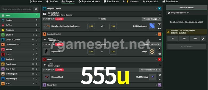 O 555u oferece uma grande seleção de opções de apostas em e-sports com probabilidades competitivas